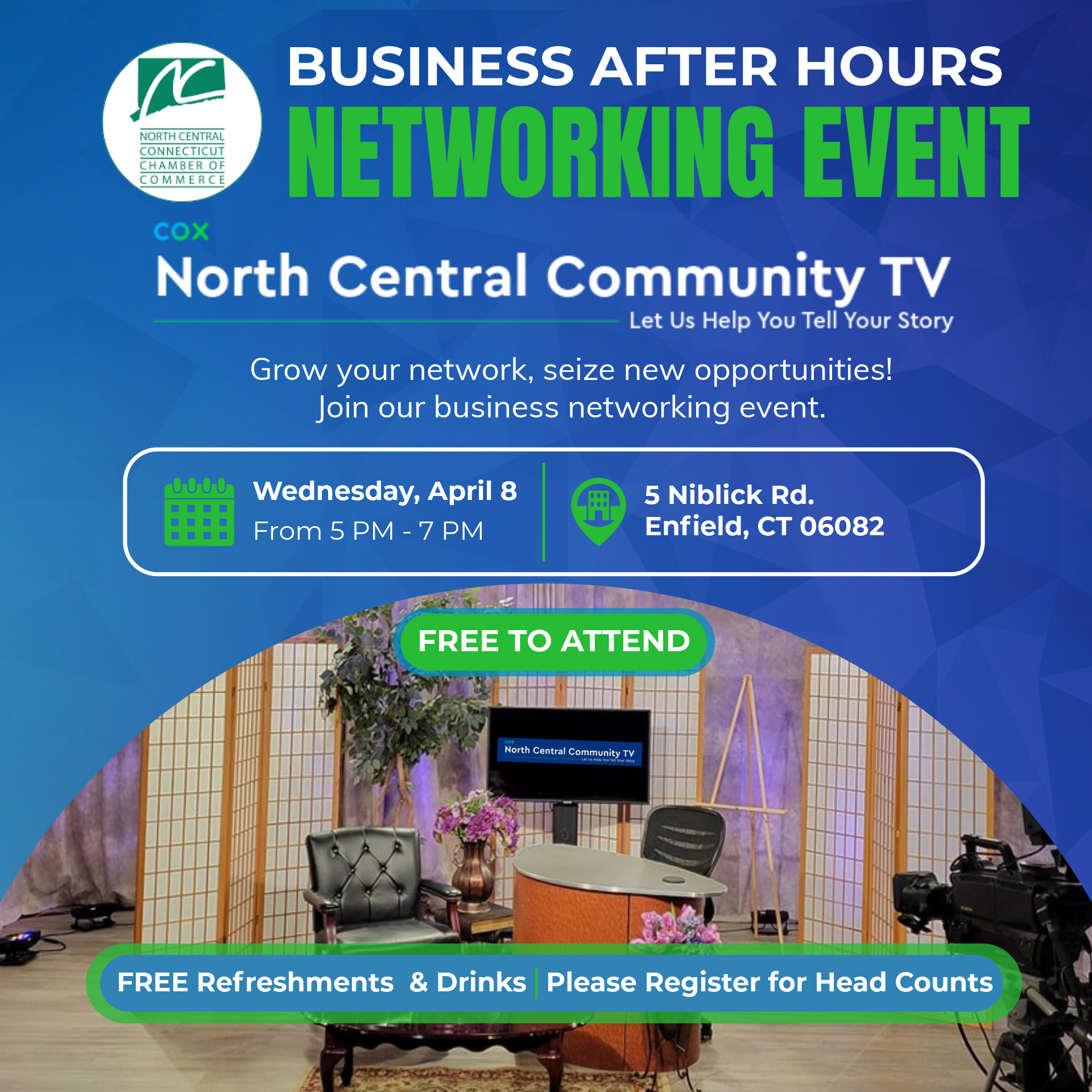 Join us for a Business After Hours networking event hosted by North Central Community TV on Wednesday, April 8th from 5:00–7:00 PM. This is a great opportunity to grow your network, connect with fellow professionals, and discover new opportunities in a relaxed and welcoming environment. Enjoy refreshments while building meaningful business relationships within our chamber community.