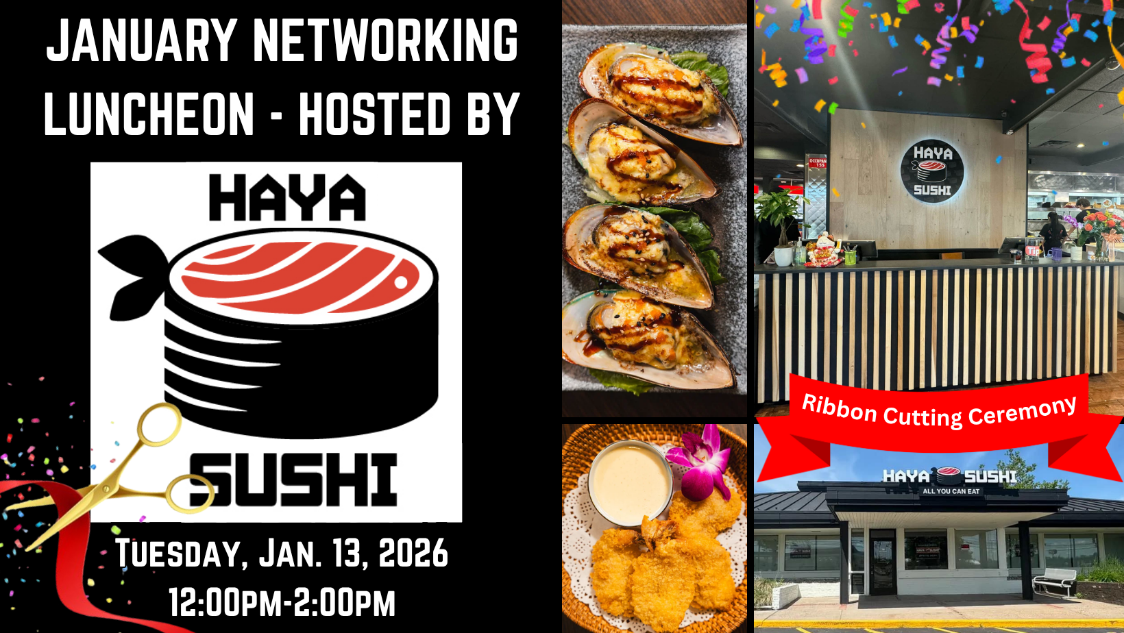 Kick off 2026 with our first Networking Luncheon of the year at Haya Sushi! We are thrilled to welcome Haya Sushi to the Chamber family and celebrate the first luncheon at their business and the New Year with a special Ribbon Cutting ceremony. This luncheon is a perfect opportunity to connect with fellow Chamber members, make new business contacts, and enjoy a delicious lunch in a welcoming setting.